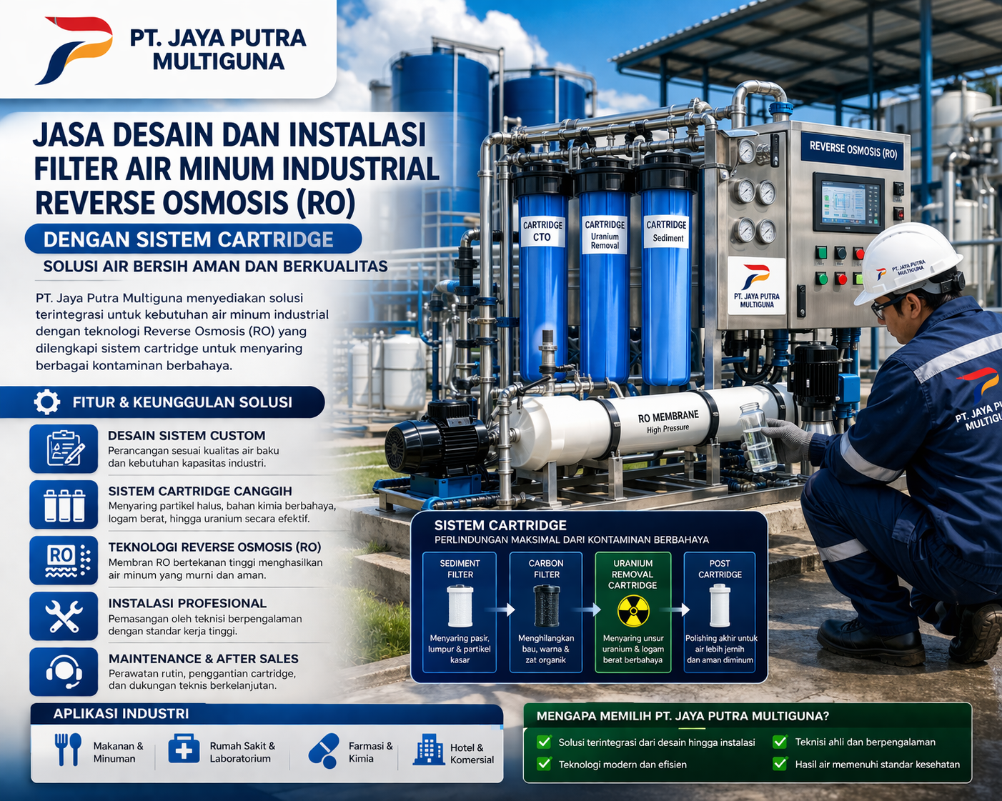 PT. Jaya Putra Multiguna hadir sebagai penyedia jasa instalasi filter air RO industrial, menawarkan solusi lengkap mulai dari desain sistem, pemilihan teknologi, hingga instalasi dan maintenance, termasuk sistem cartridge untuk penyaringan zat berbahaya.